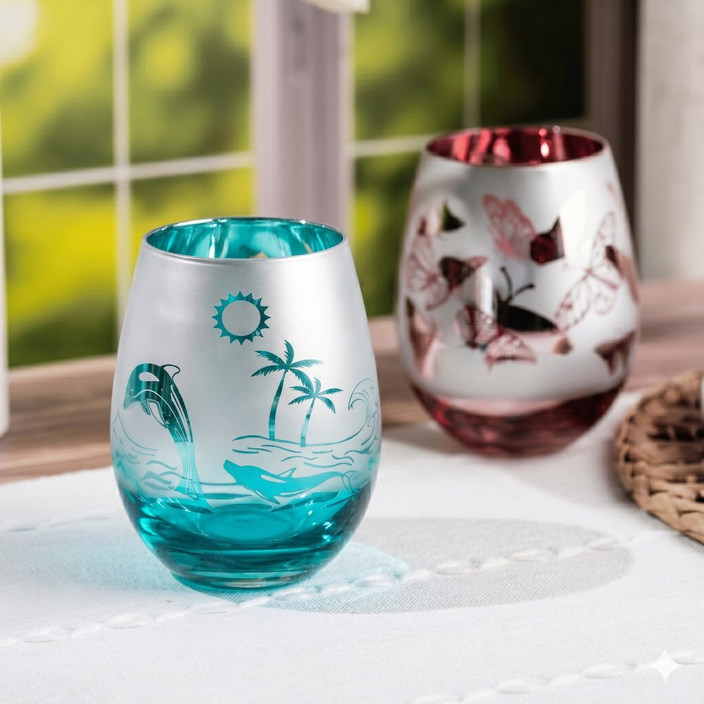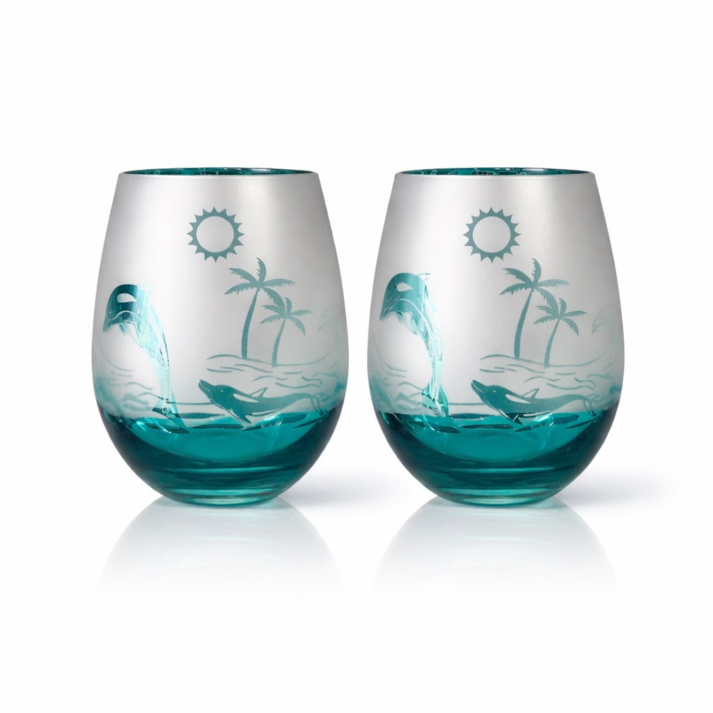 Engraved with a scene of dolphins, these beautiful glasses are designed with a shimmery silver & blue finish, and a dazzling blue interior that will light up the room.