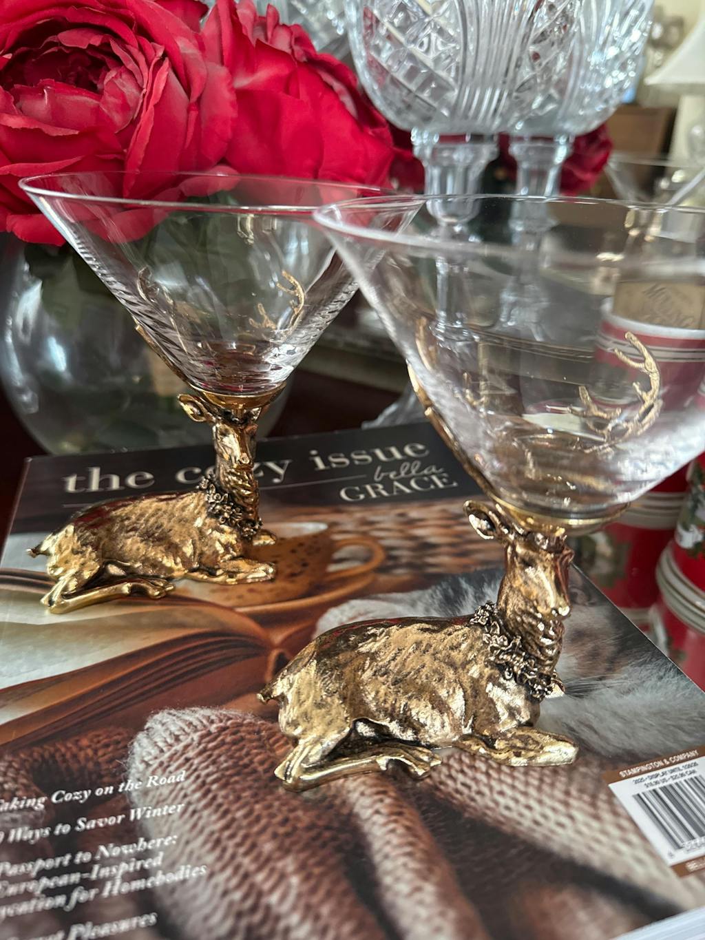 The sturdy brass stag and his proud antlers hold the martini glass securely in place for an extraordinary visual delight.