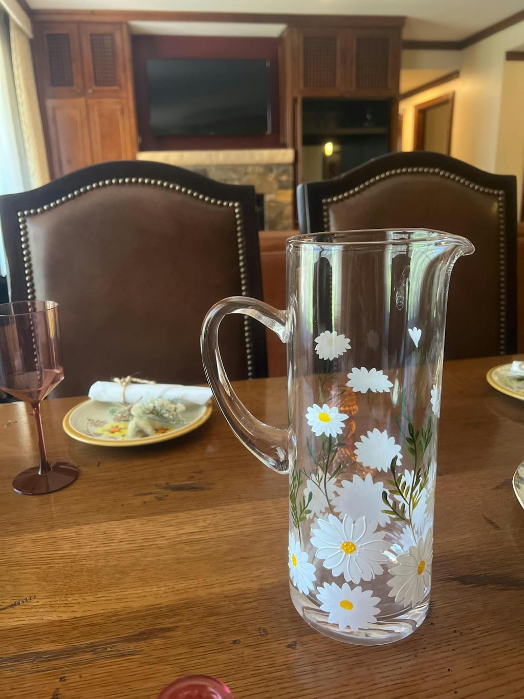 Bring the beauty and joy of spring into your home with our large glass pitcher with daisies. It's the perfect way to welcome the season and add a touch of natural charm to your living space.