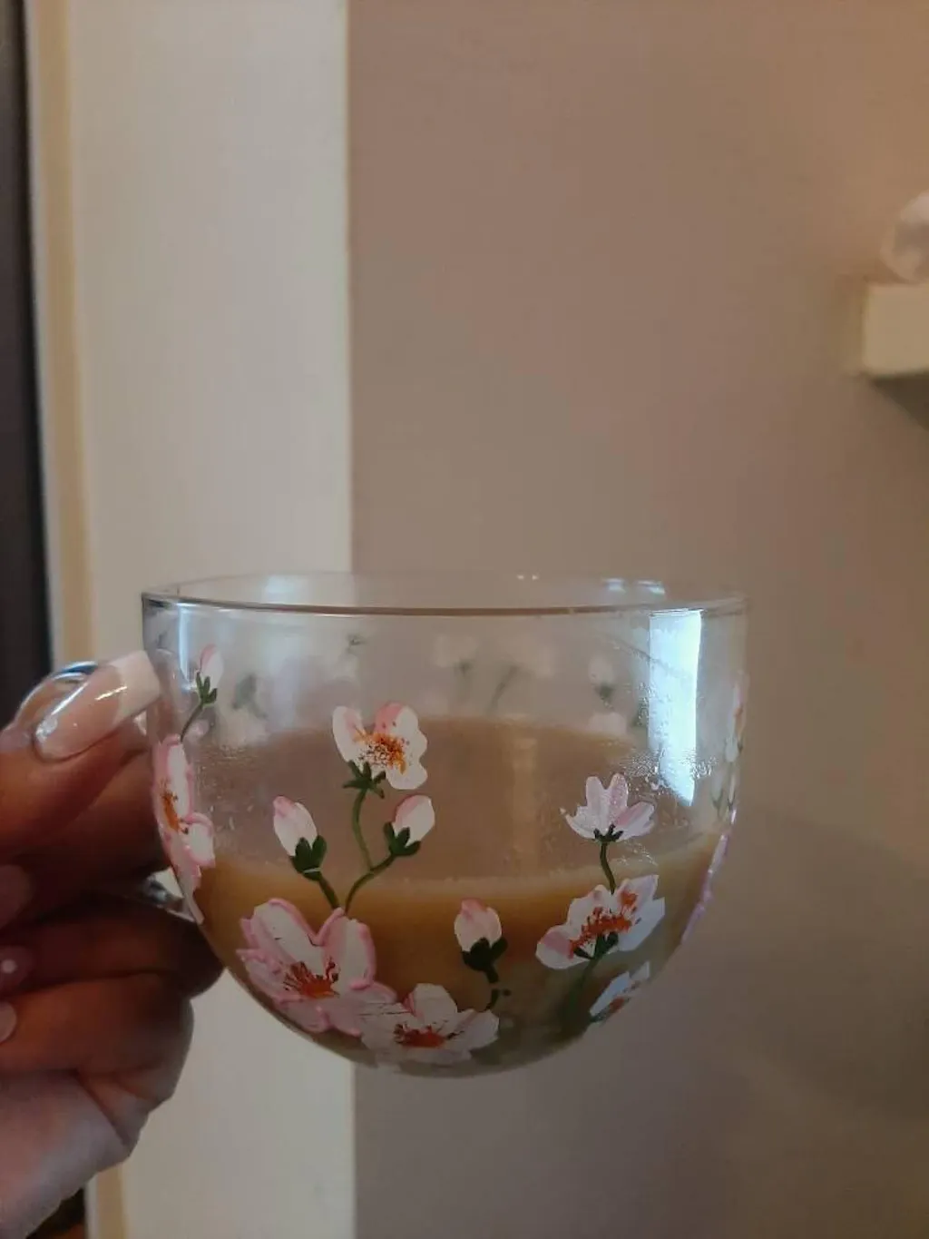 The lifelike and vibrant cherry blossom design is carefully detailed, showcasing shades of pink and white, creating a stunning impression of natural beauty. The entire surface of the mug is covered in cherry blossoms, making it a perfect addition to any glassware collection.
