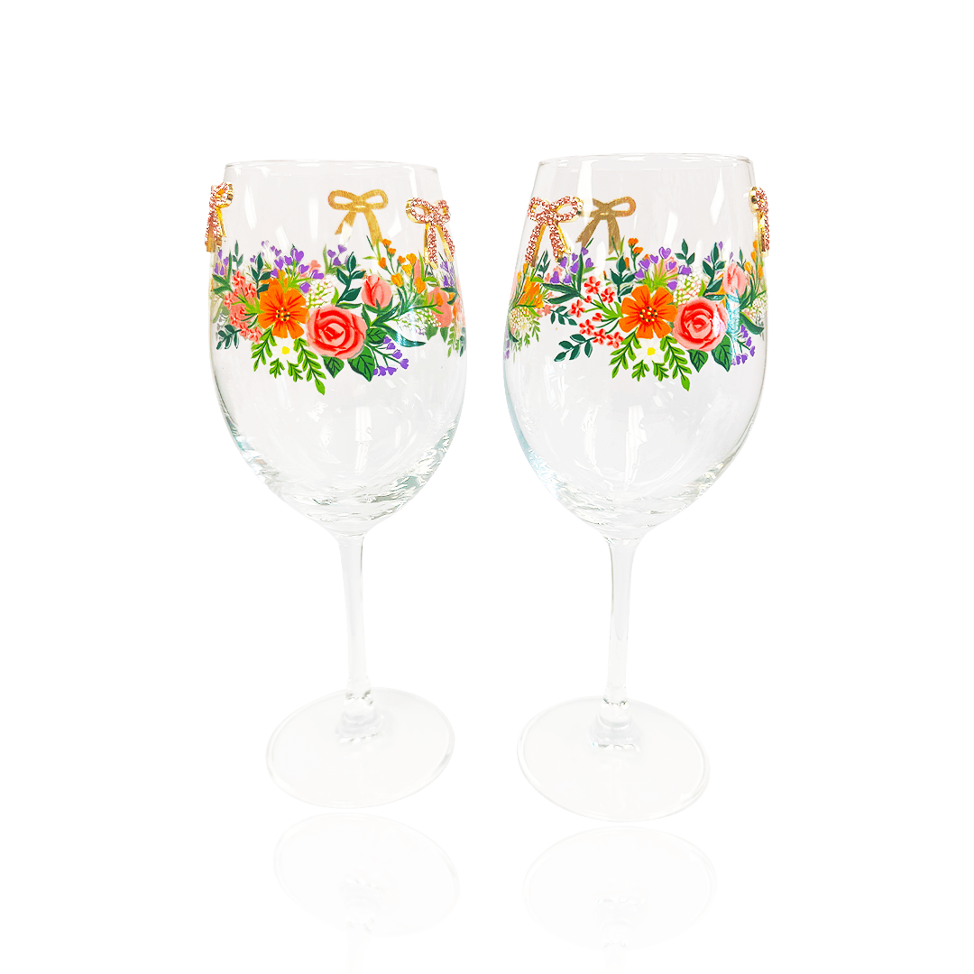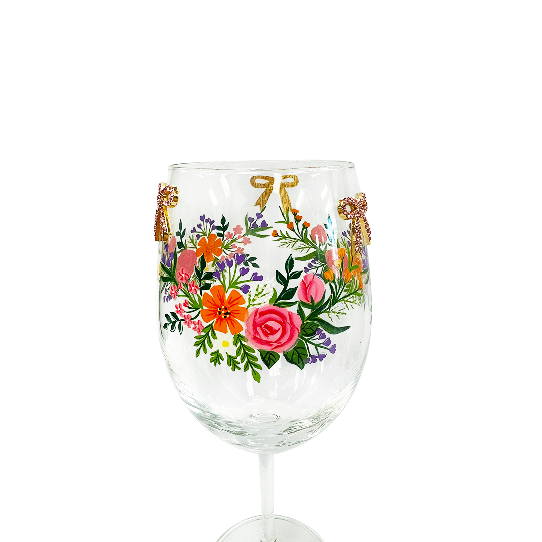 Sip in style with this stunning stemmed wine glass, adorned with a floral wrap and three pink jeweled bows for a touch of sparkle. The elegant stem adds a classic feel, making every pour feel extra special.