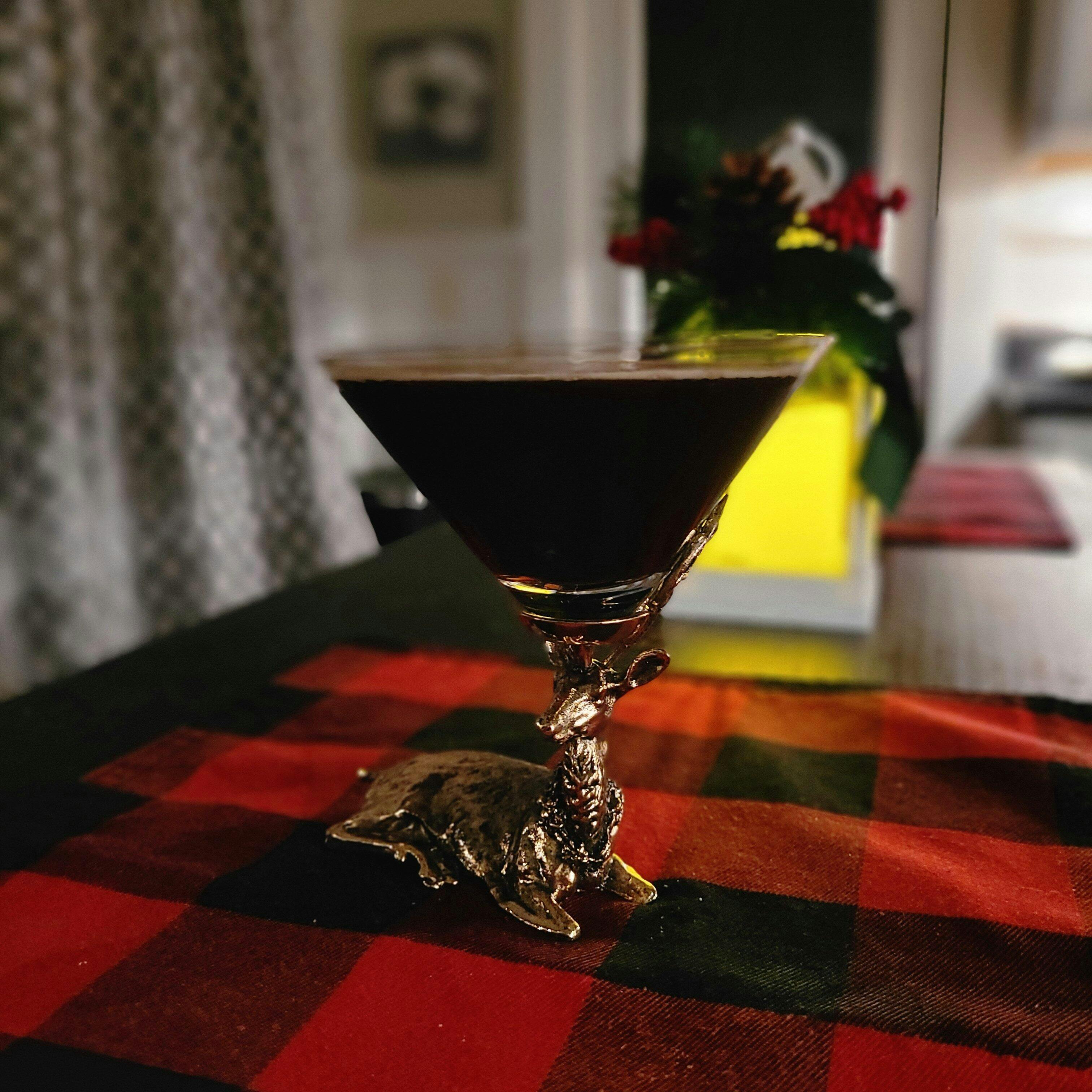 The sturdy brass stag and his proud antlers hold the martini glass securely in place for an extraordinary visual delight.