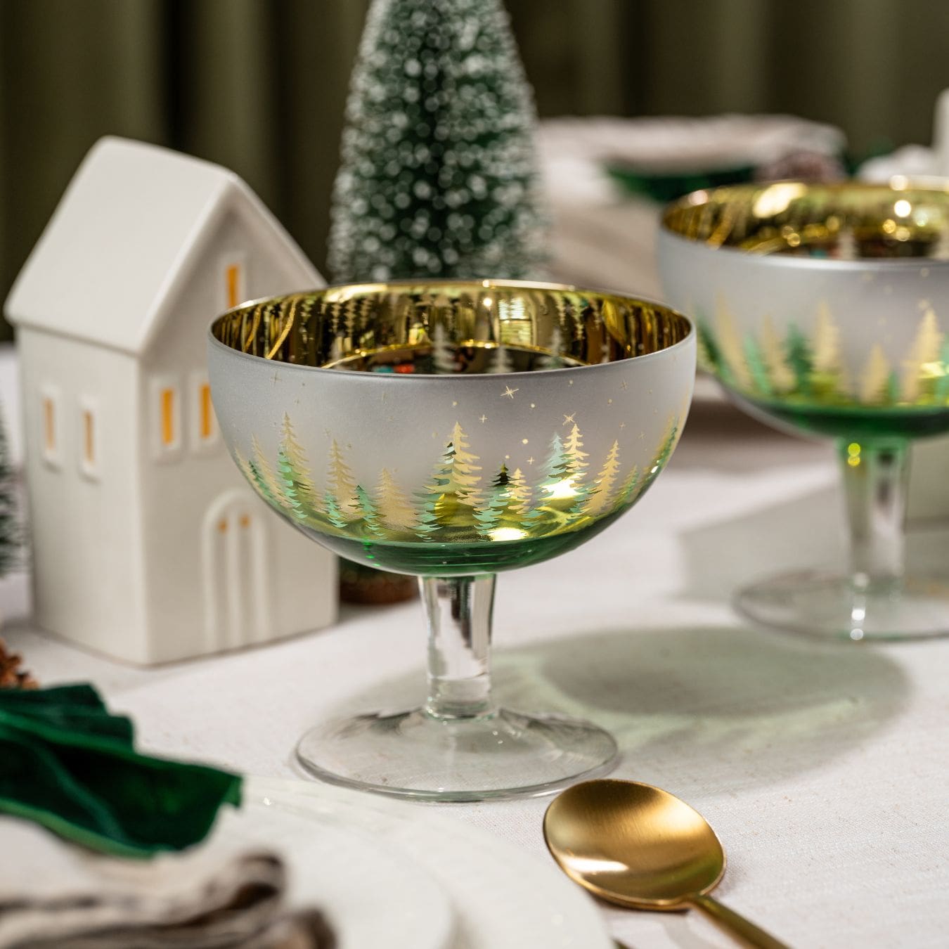 Engraved with a nostalgic wintery scene of pine trees, these Christmas Dessert Bowls are designed with a shimmery silver & green finish, and a dazzling gold interior that will light up the room.